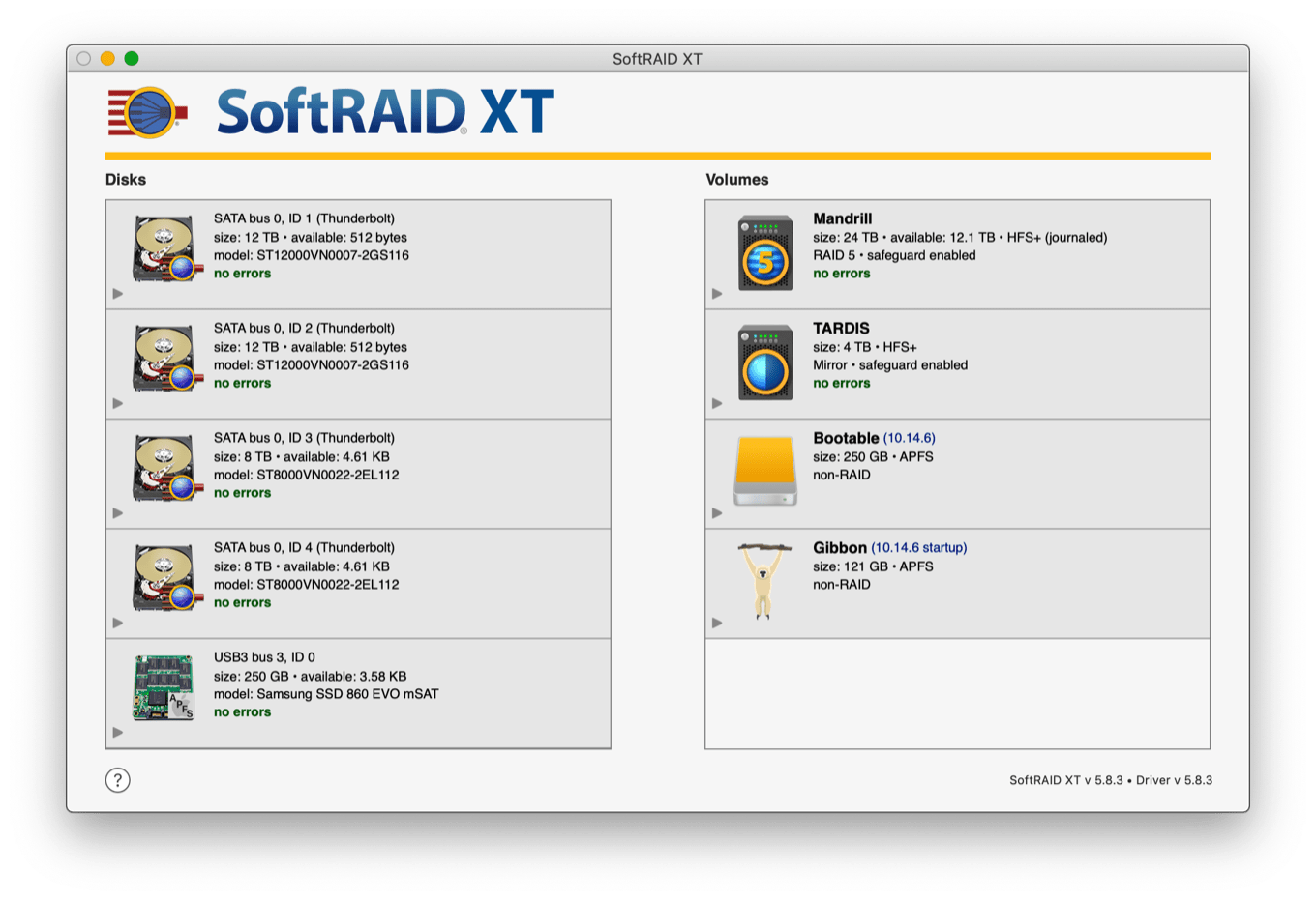 SoftRAID also allowed me to set up the spare 4TB portions of my two larger drives as a mirrored volume, which I use for Time Machine backups from my other Macs. Because that volume is mirrored—in other words, all the data is identical on the two separate drives—I’ve once again got some data redundancy in case one drive mechanism dies.