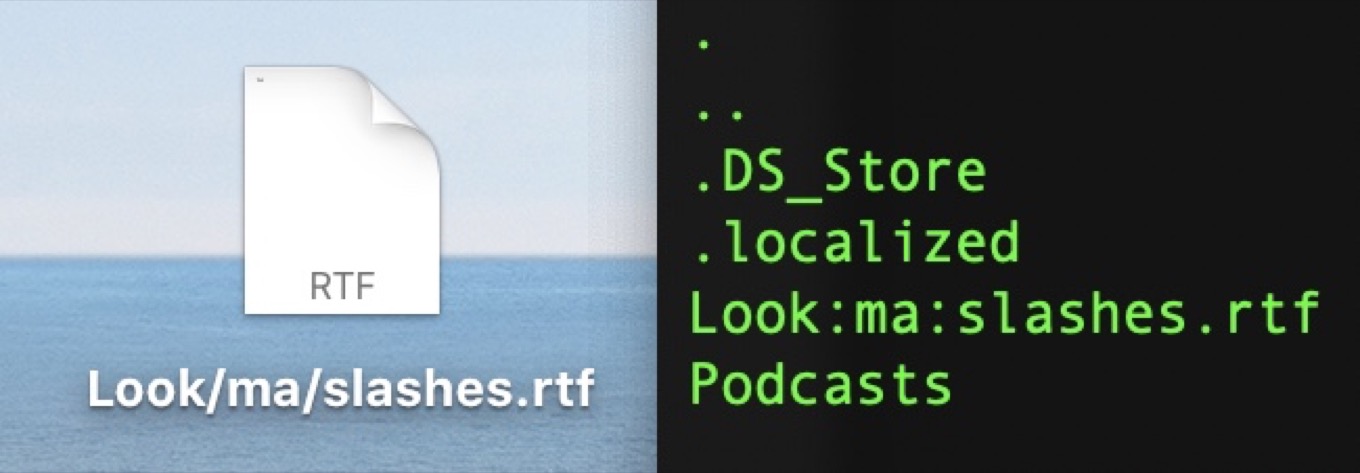 - Fun trivia time! In the classic Mac OS, directory hierarchies were indicated using the colon (“:”). But, when Apple moved to Mac OS X, which was based on BSD, directories instead used the more common forward-slash (“/”) delimiter. Problem is, back in the classic Mac OS days, you could put all the forward-slashes you wanted in a filename and the system didn’t care—until you migrated all those files to Mac OS X, where the file system very much did not want slashes in file names. But, in order to keep backwards compatibility with classic APIs, Apple essentially converted all those slashes in file names to colons, but still displays them as forward slashes anywhere in the GUI. To this day, you can still put forward slashes in your filenames, but if you go and look in the Terminal, they’re colons. However, if you try to put colons in filenames, it’ll generally automatically use a hyphen instead. Computers are weird. ↩